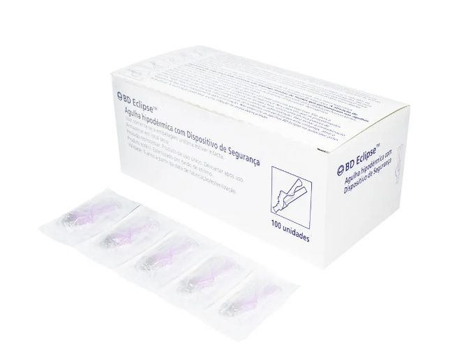Agulha Eclipse Hipodérmica com Dispositivo de Segurança Ref: 303354 da BD, para utilização em seringas, siliconizada para melhor deslize e menor dor do paciente.